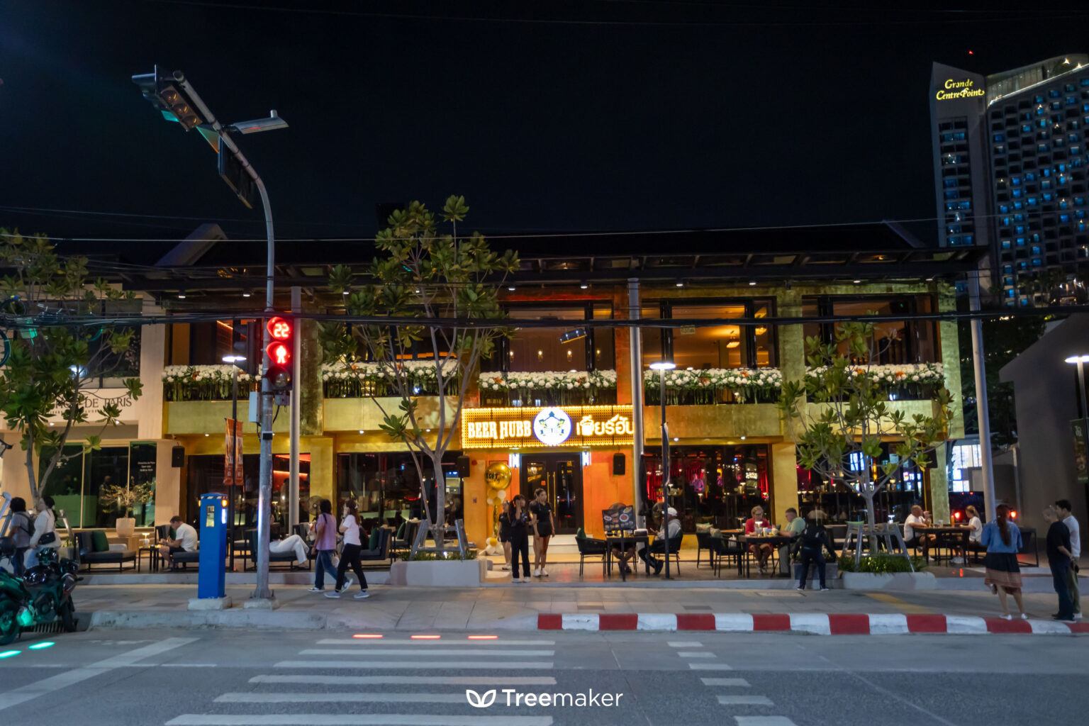 Beer Hub is beautifully decorated with white floral fencing that adds a soft and elegant touch to the space. The seating area is enhanced with a vertical garden behind the sofas, creating a lush and relaxing atmosphere for customers.